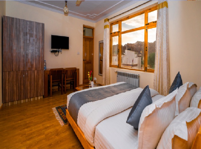 Hotel Om Ladakh at Leh is nicely located where you can view the mighty mountains with a few snow laden peaks adding to its beauty. It is at some distance from market place. The hotel structure and decor is good. The staff is from Agra. They are very caring and friendly. The food preparation is quite good. Only con is its beds. Wifi is slow but good for Whatsapp messages.